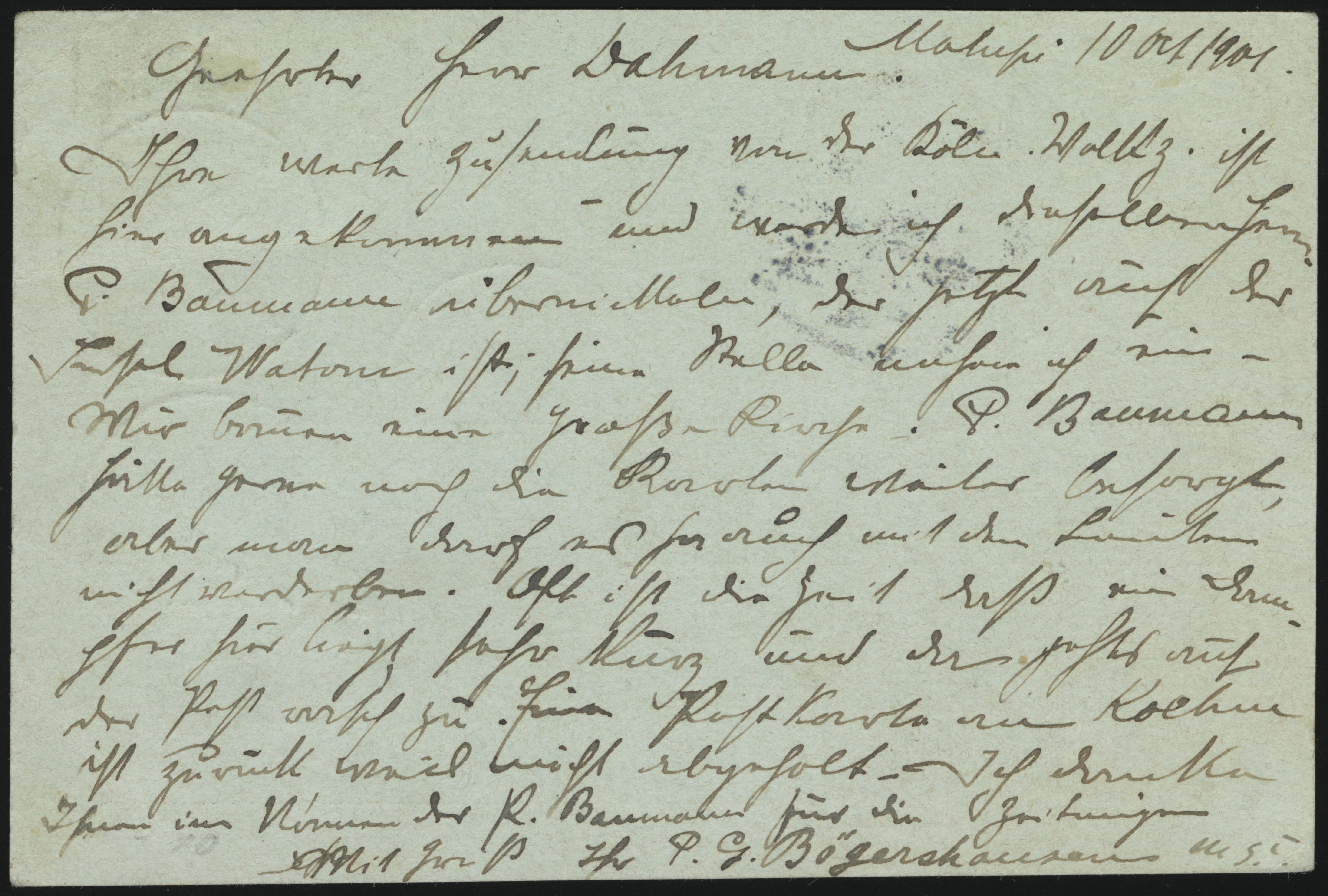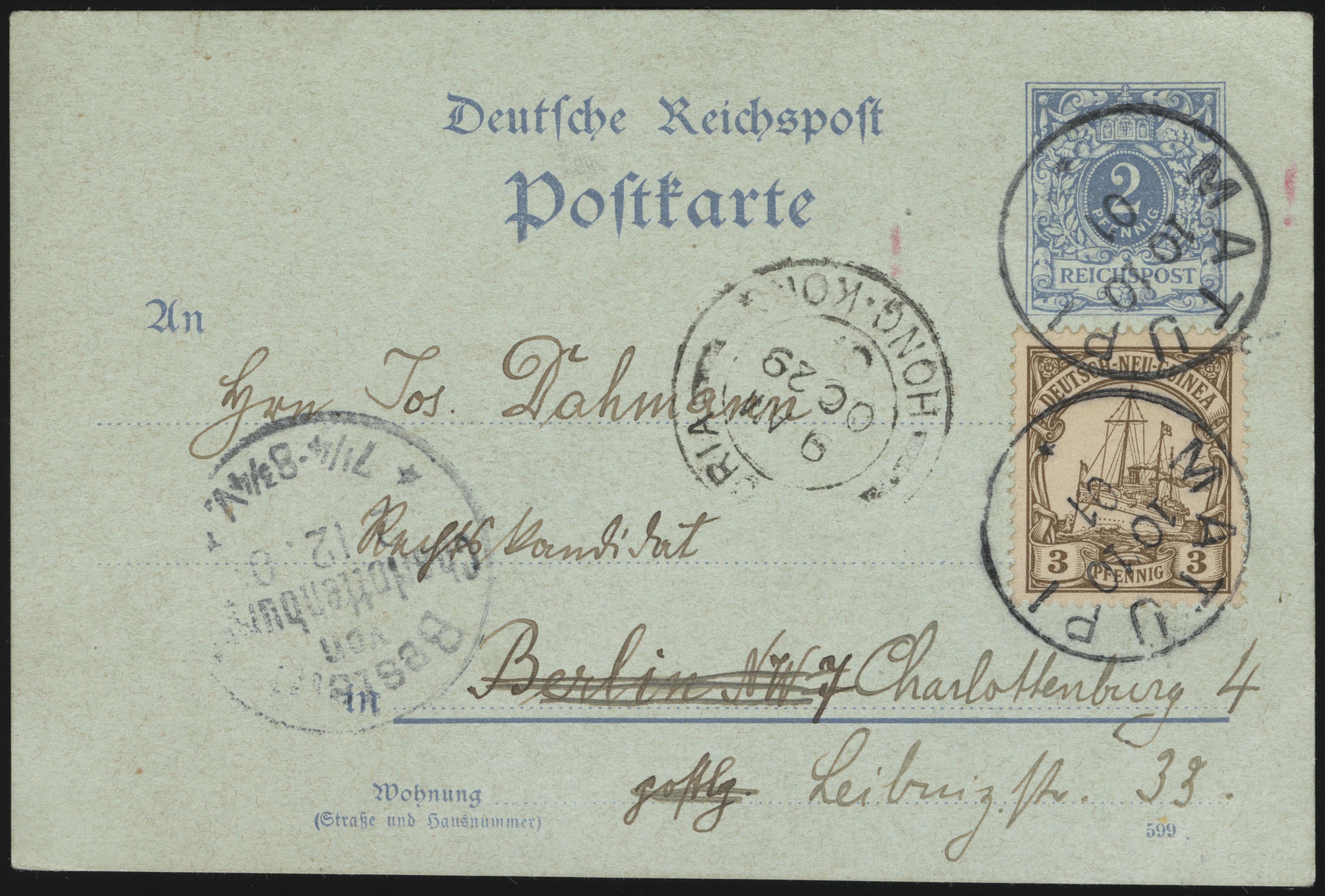 In the mid-1870’s, German companies established the first trading ties within the area that would become German New Guinea. In 1884, the German flag was raised over several coastal towns, and the Neu Guinea Kompagnie was chartered to administer the area in 1885. This included the ability to administer postal services.