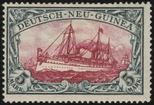 The overprint issues used throughout the German colonies were replaced in December 1900 with a standardized design featuring Kaiser Wilhelm II’s yacht, the Hohenzollern II