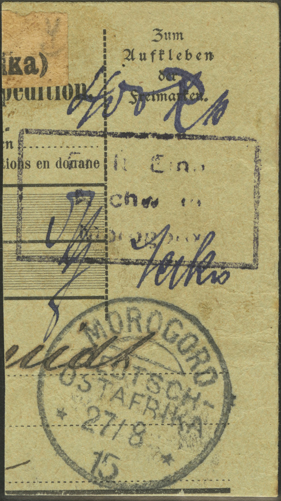 Due to increasing scarcity of lower value stamps due to WWI, in May 1915, the larger post offices in German East Africa began using cancels to denote franking.