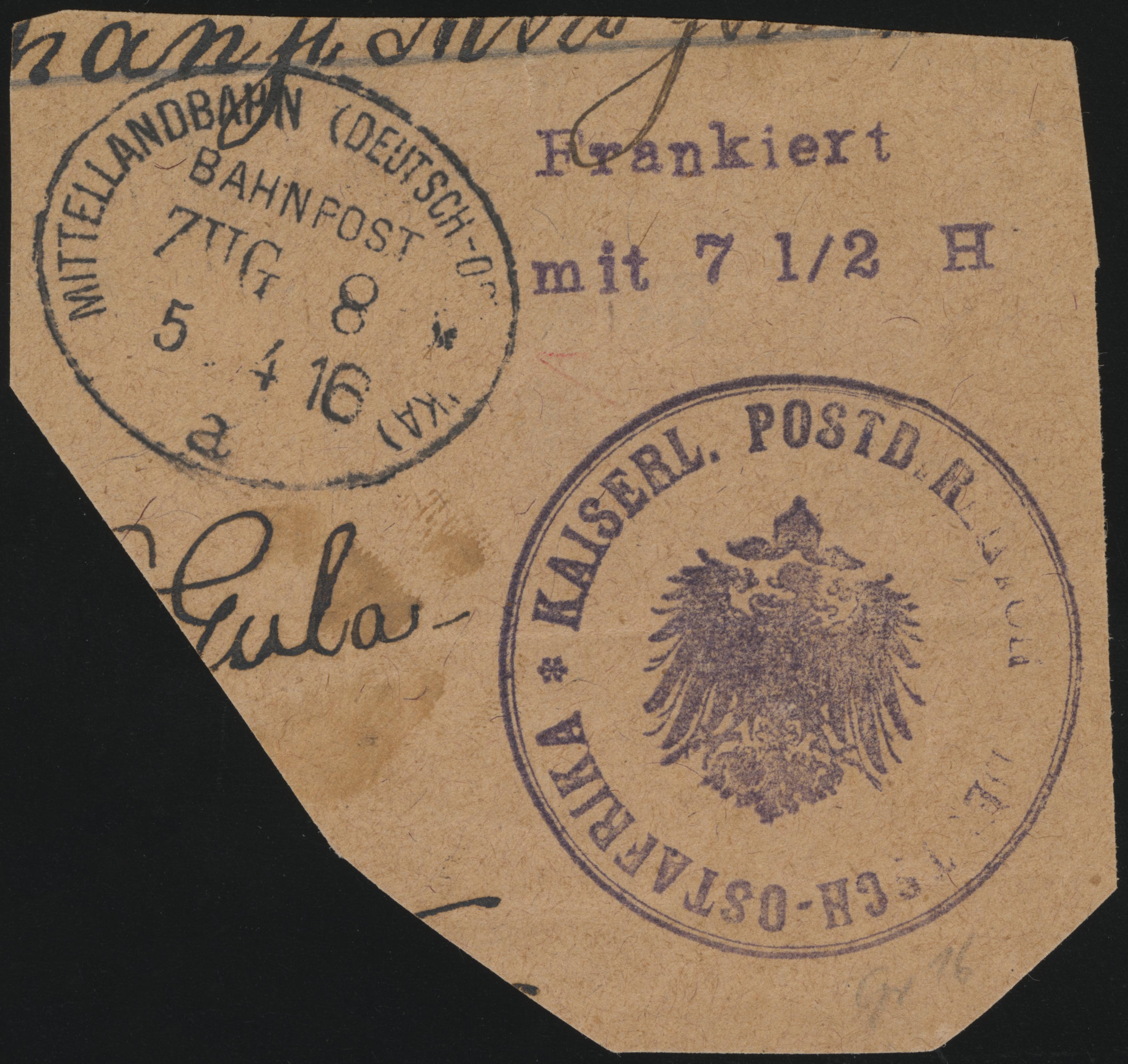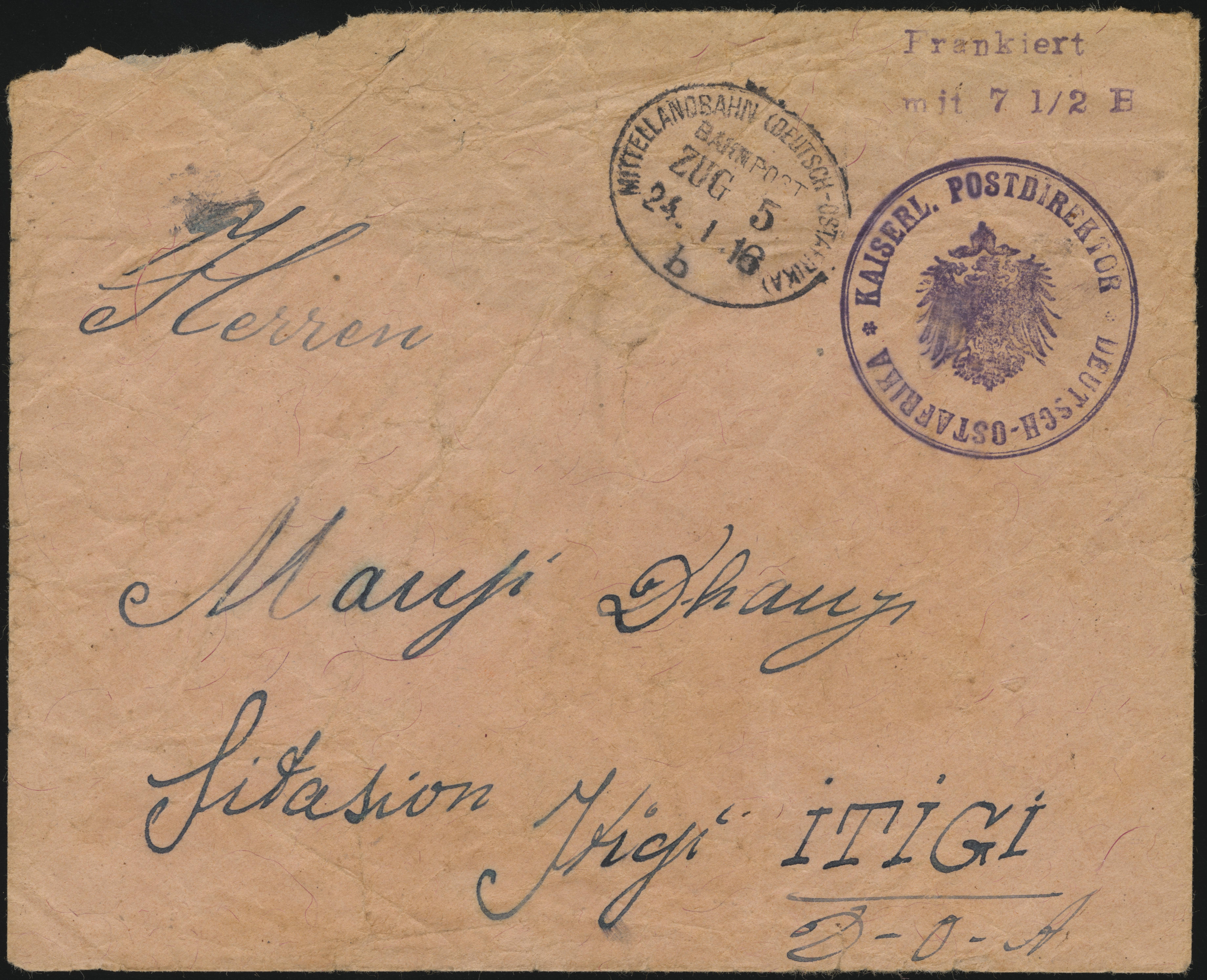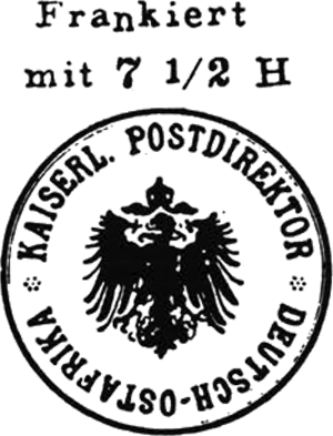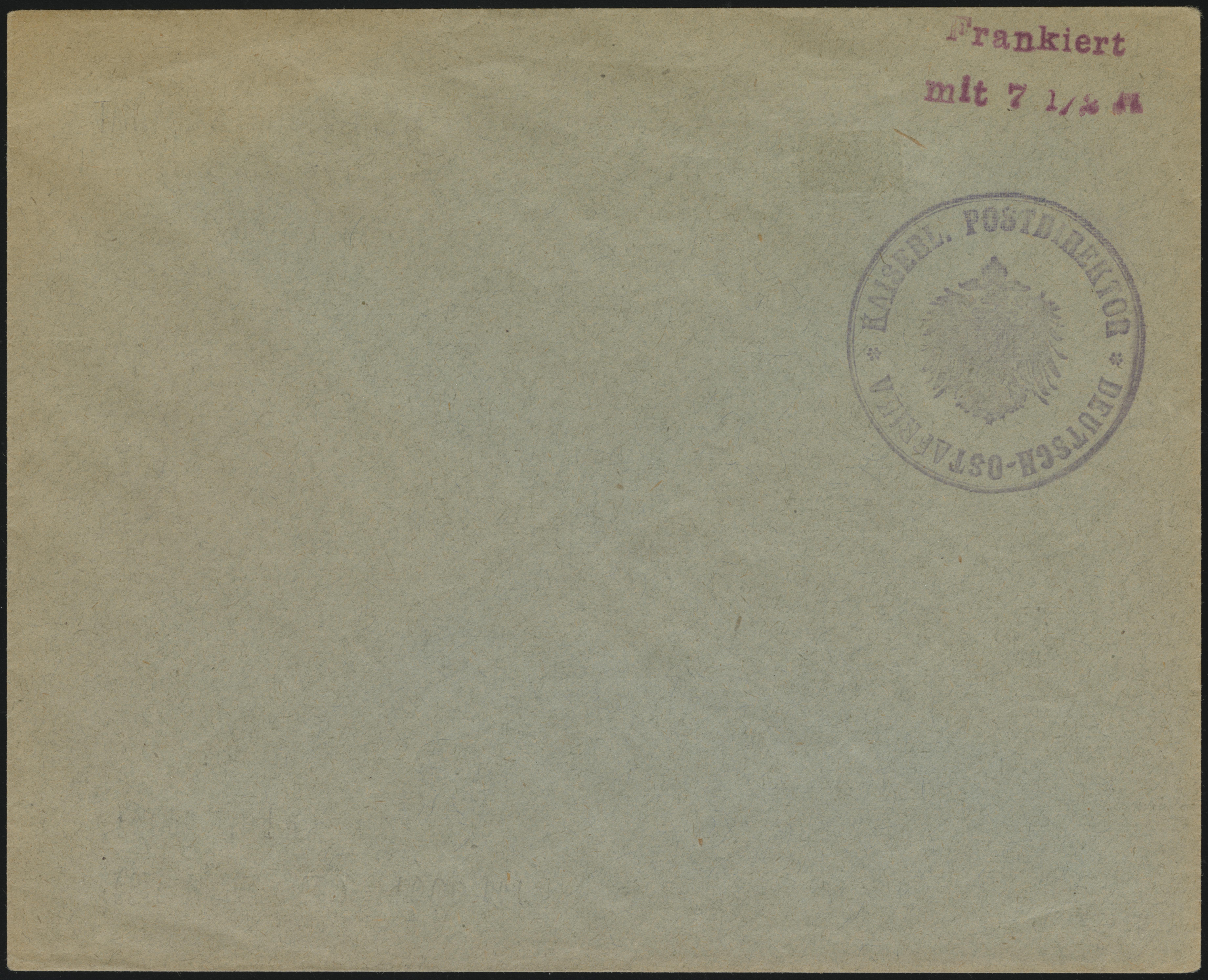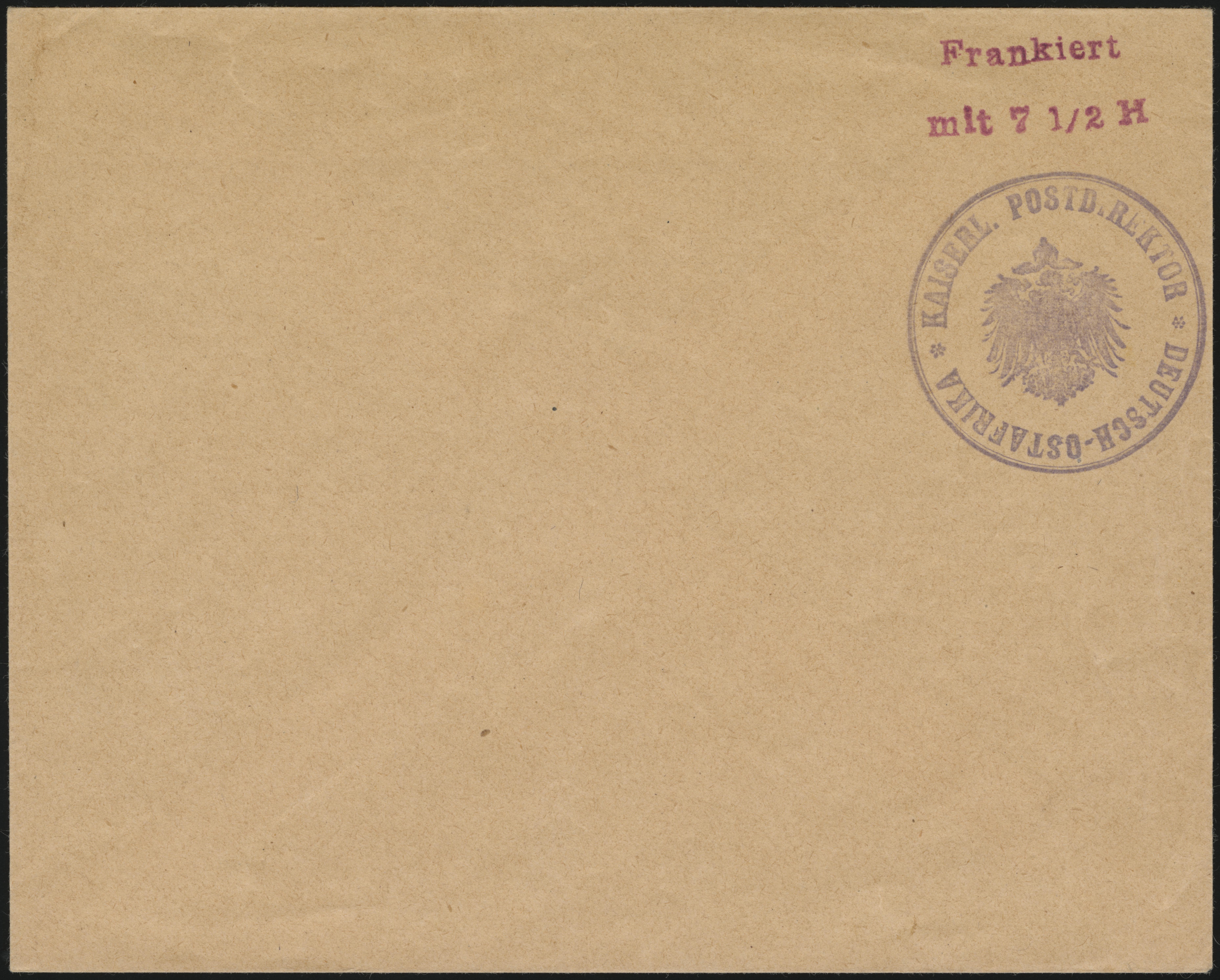 As part of the continuing efforts to alleviate the shortage of stamps due to the war situation, in January 1916, three post offices were authorized to frank pre-paid private envelopes. Envelopes could be sent from any post office to Daressalam, Morogoro, or Tanga, where they would be franked with the official seal of the Post Director and a notation that the 7½ Heller postage had been pre-paid. The pre-franked envelopes could then be used at any post office remaining open in the colony.