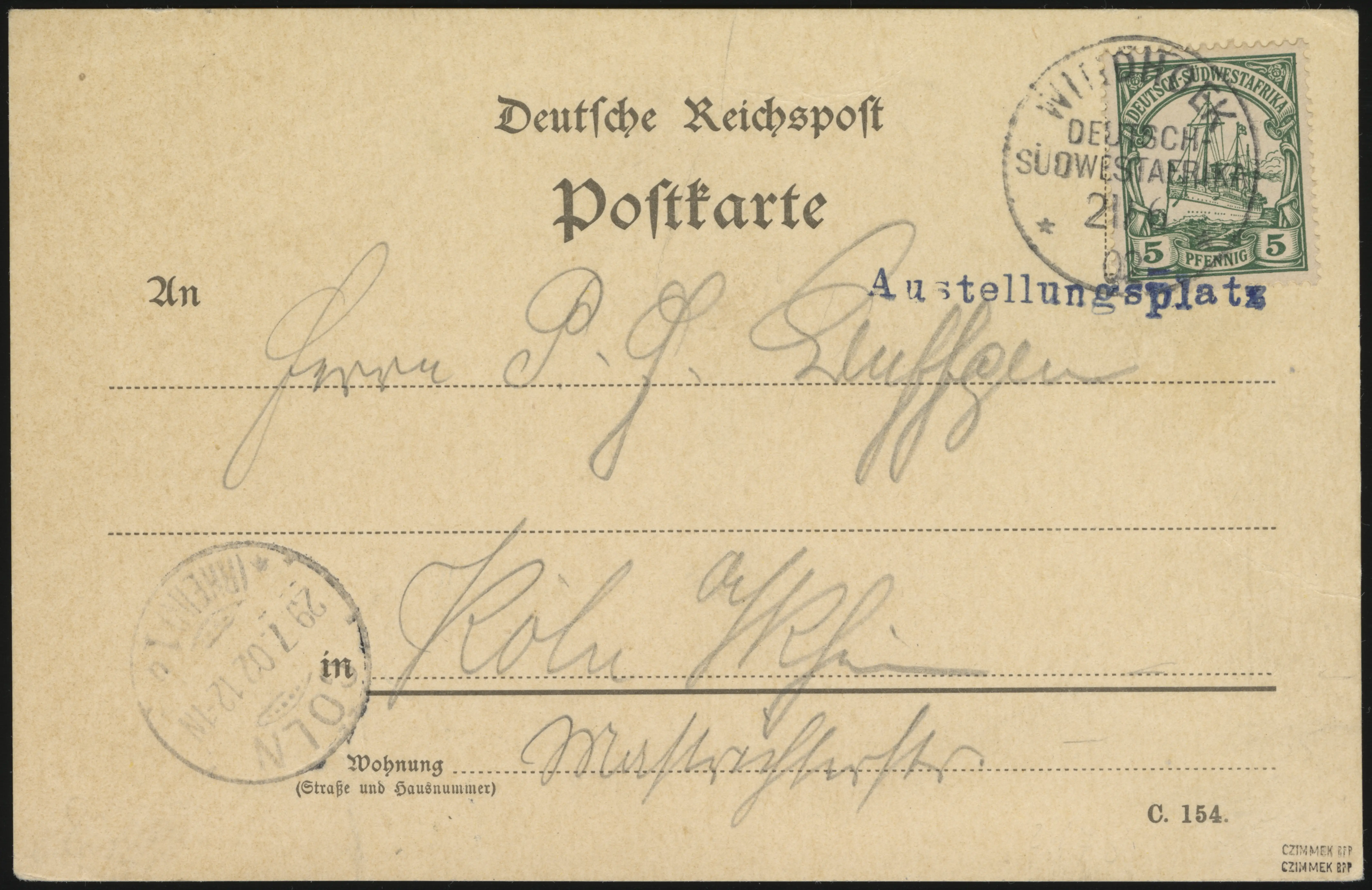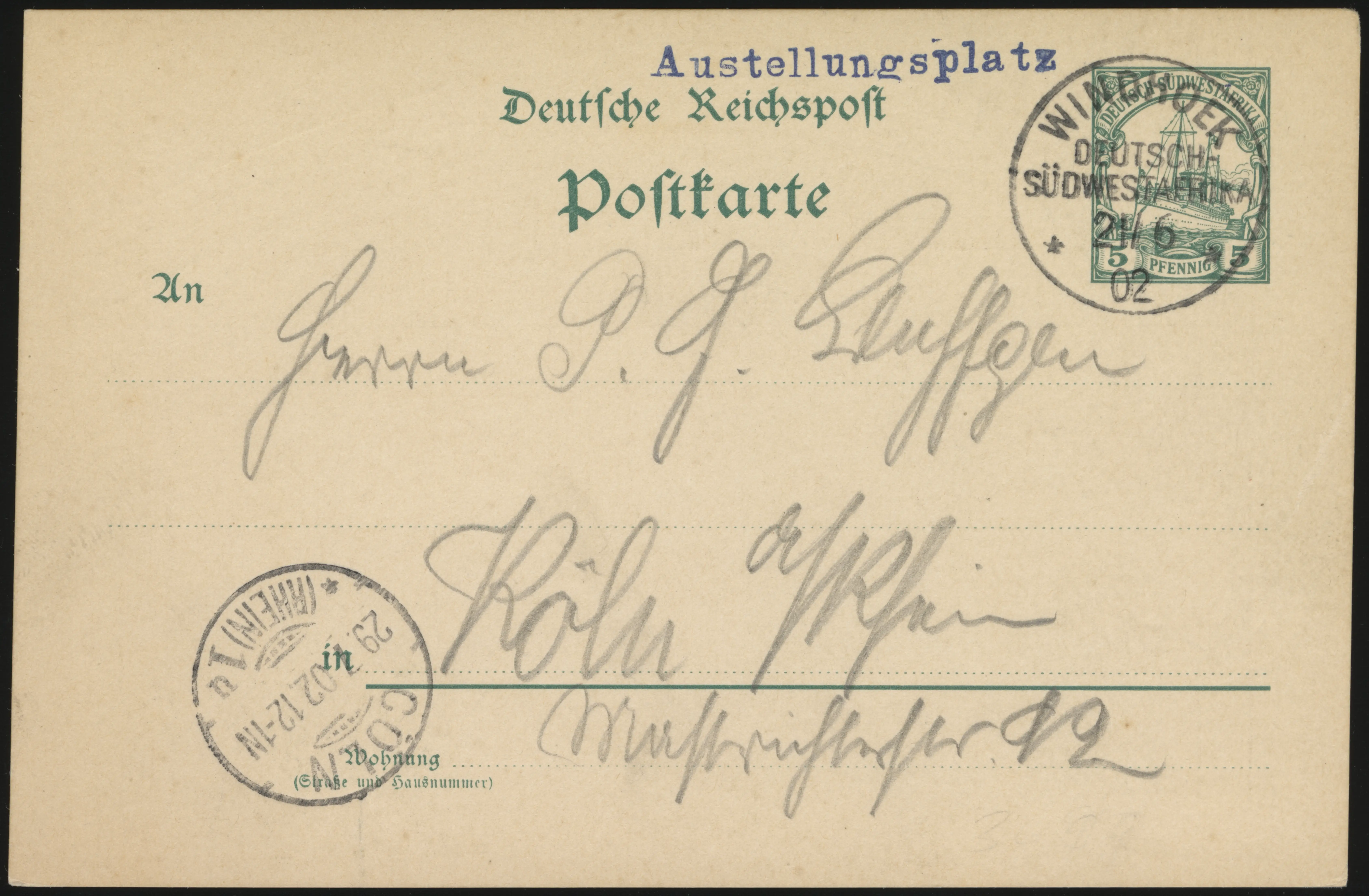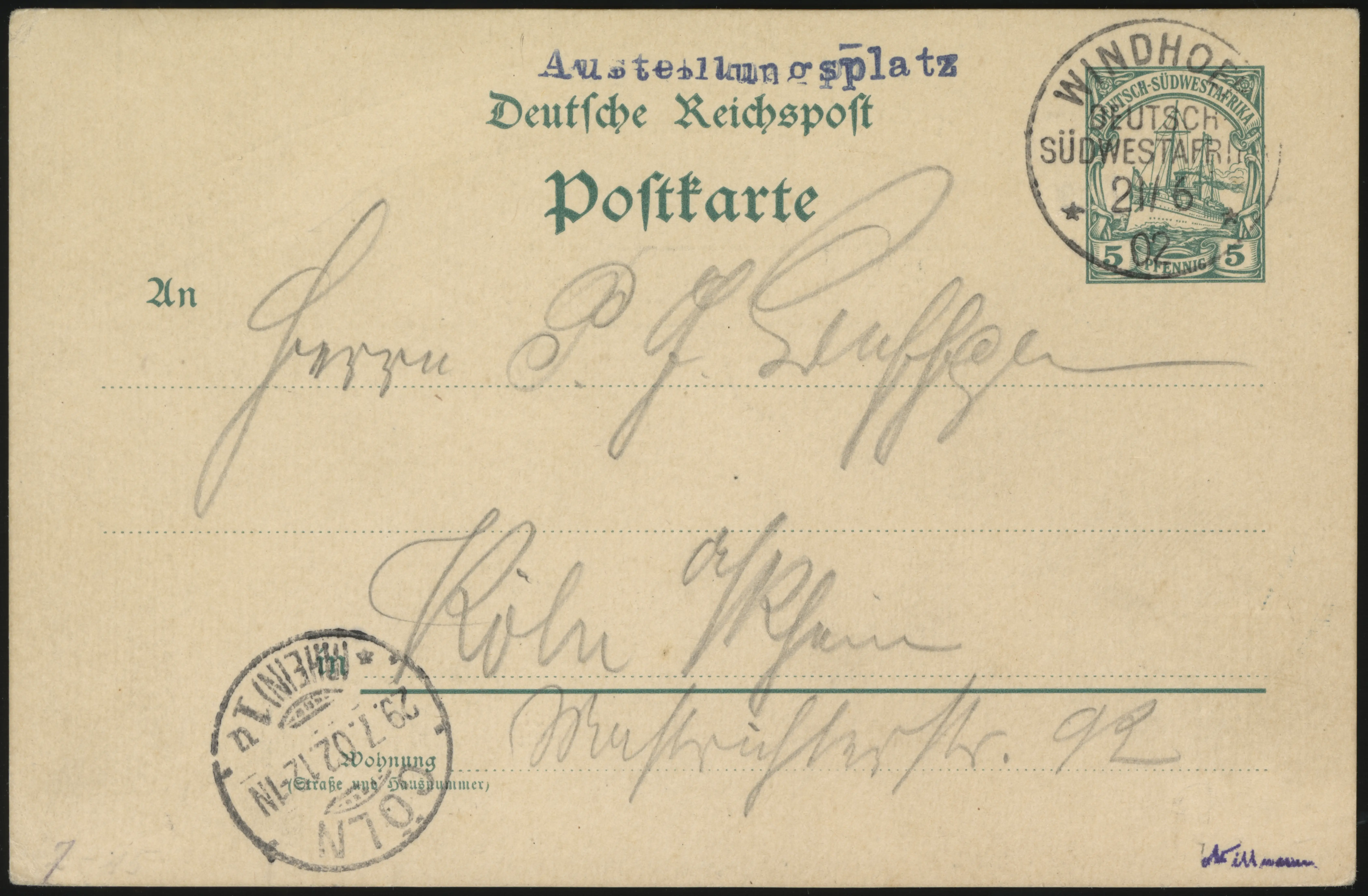 Commemorative cancels from the Exhibition feature a blue handstamp “Austellungsplatz” (misspelled in that it should be “Ausstellungsplatz”).