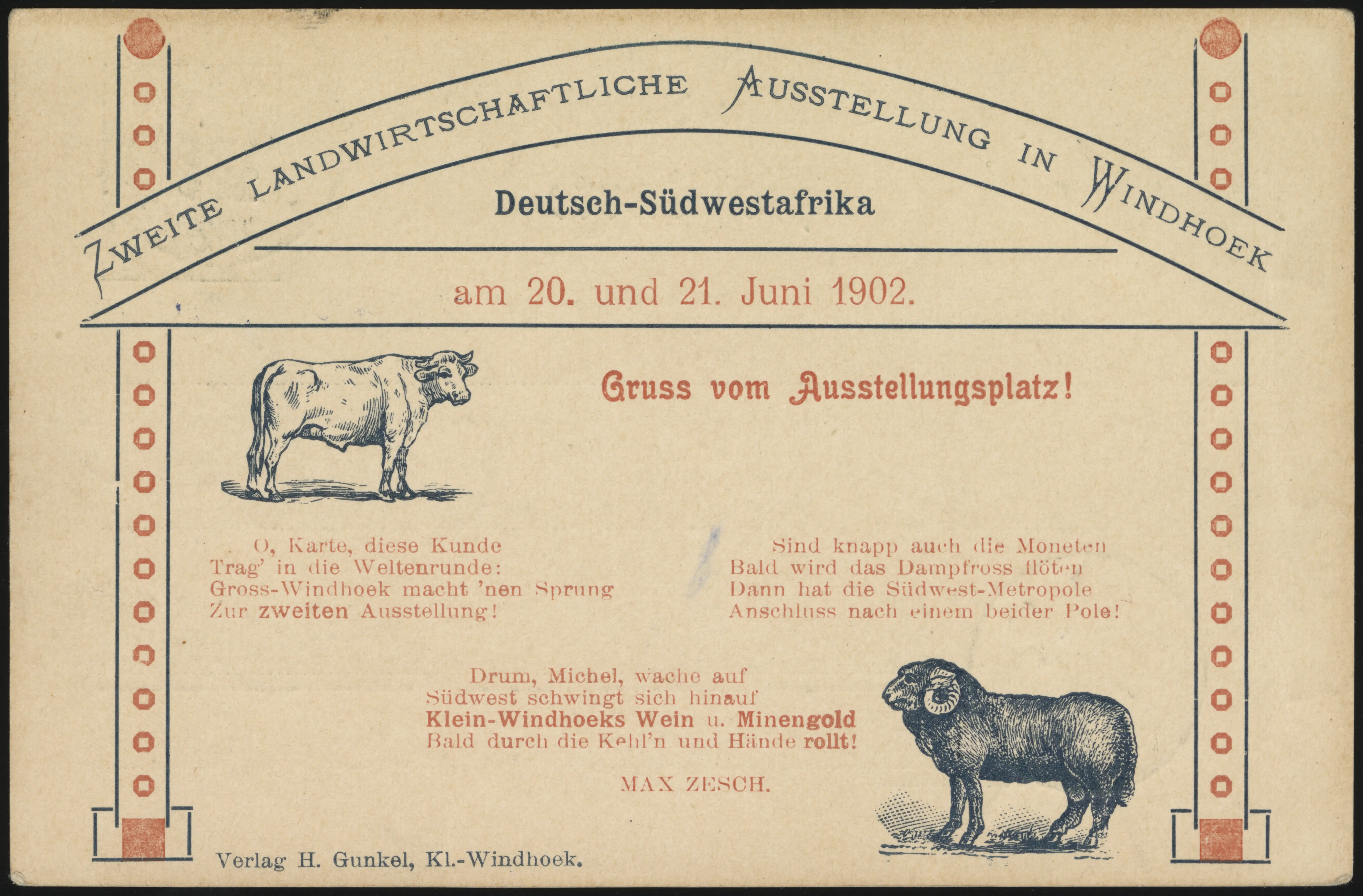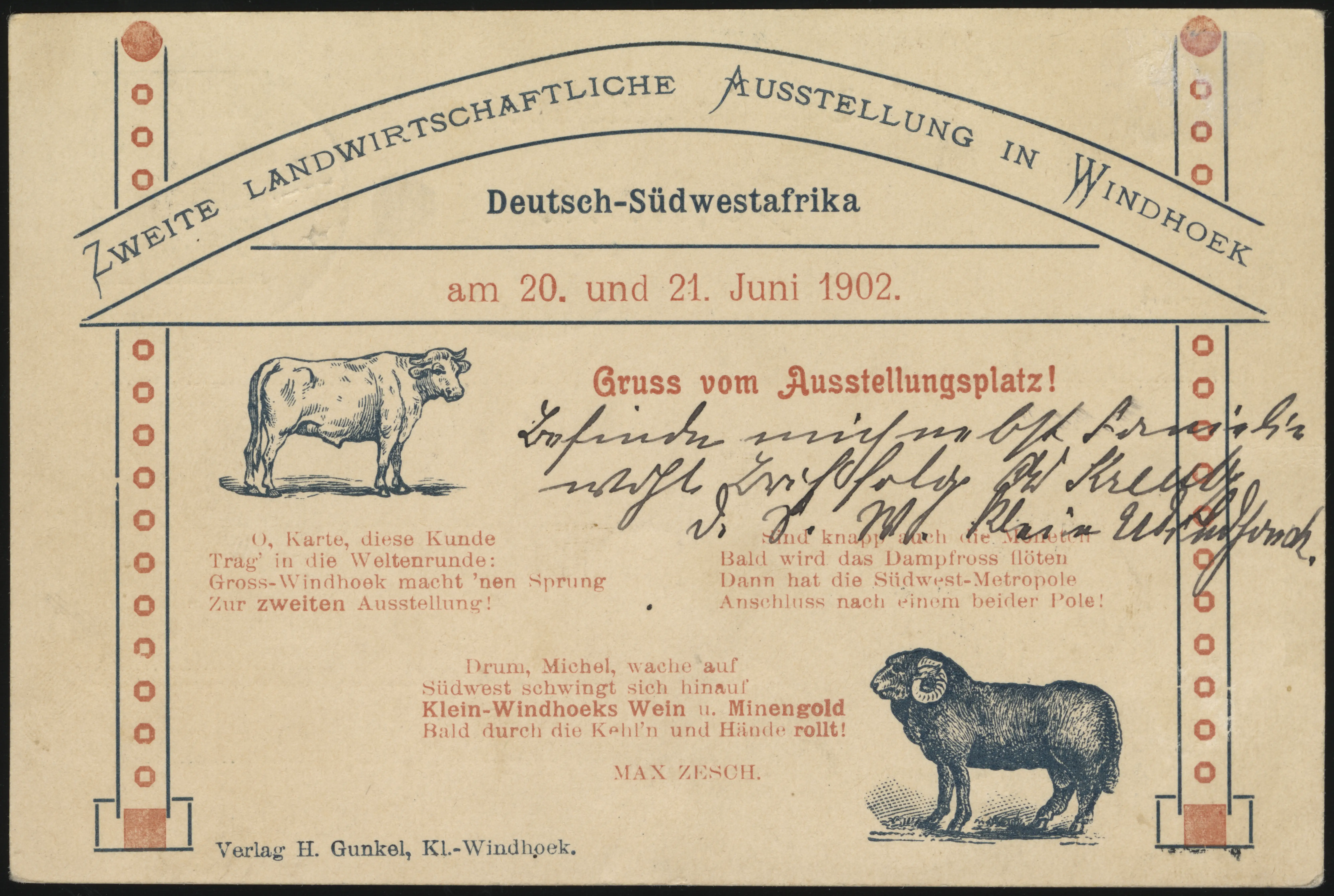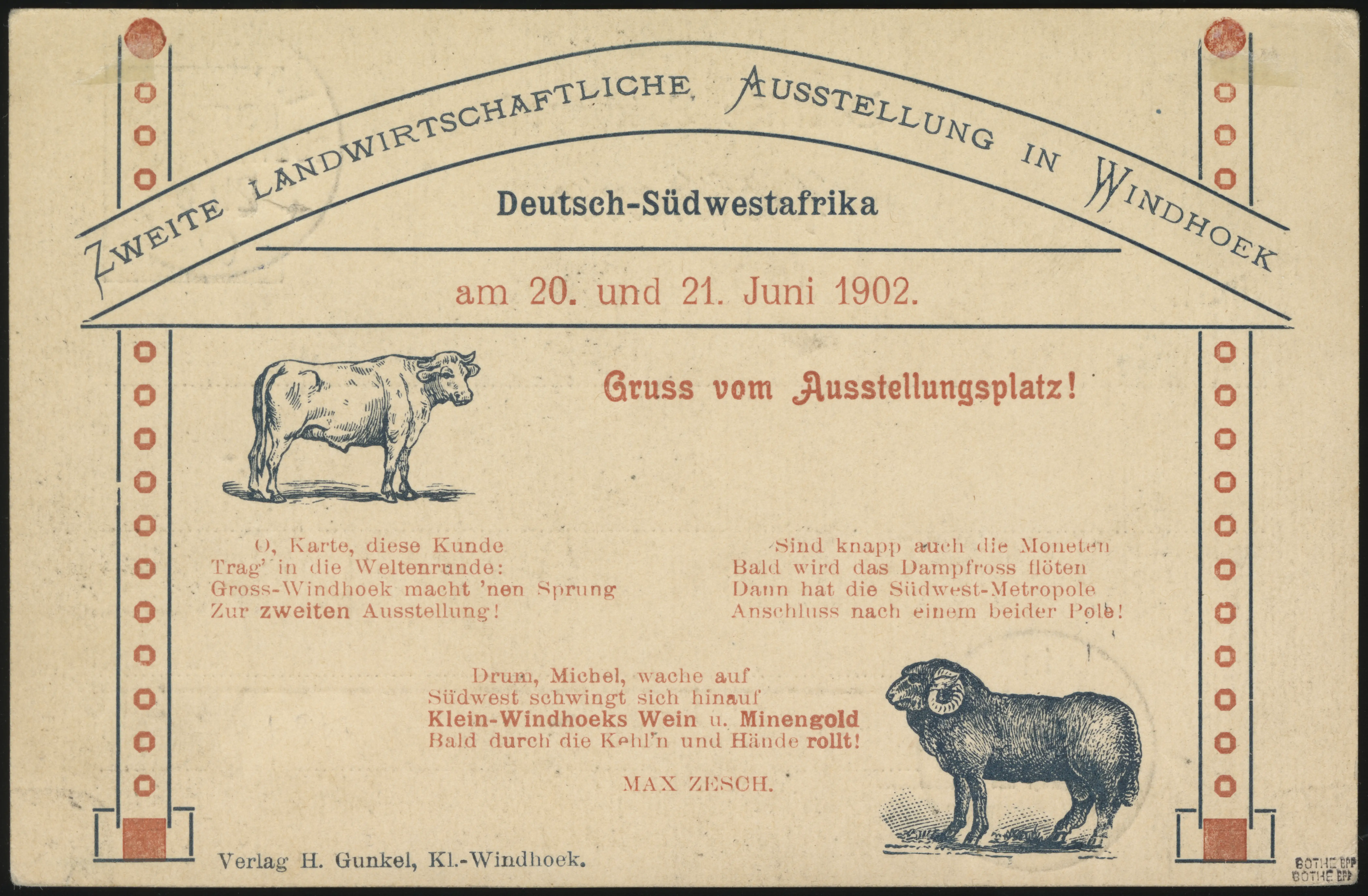 This card was issued to commemorate the Second Agricultural Exhibition in Windhoek, 20-21 June 1902. Two varieties exist, one without the poem on the back (Fr PP3 C 1) and one with (Fr PP3 C 2).