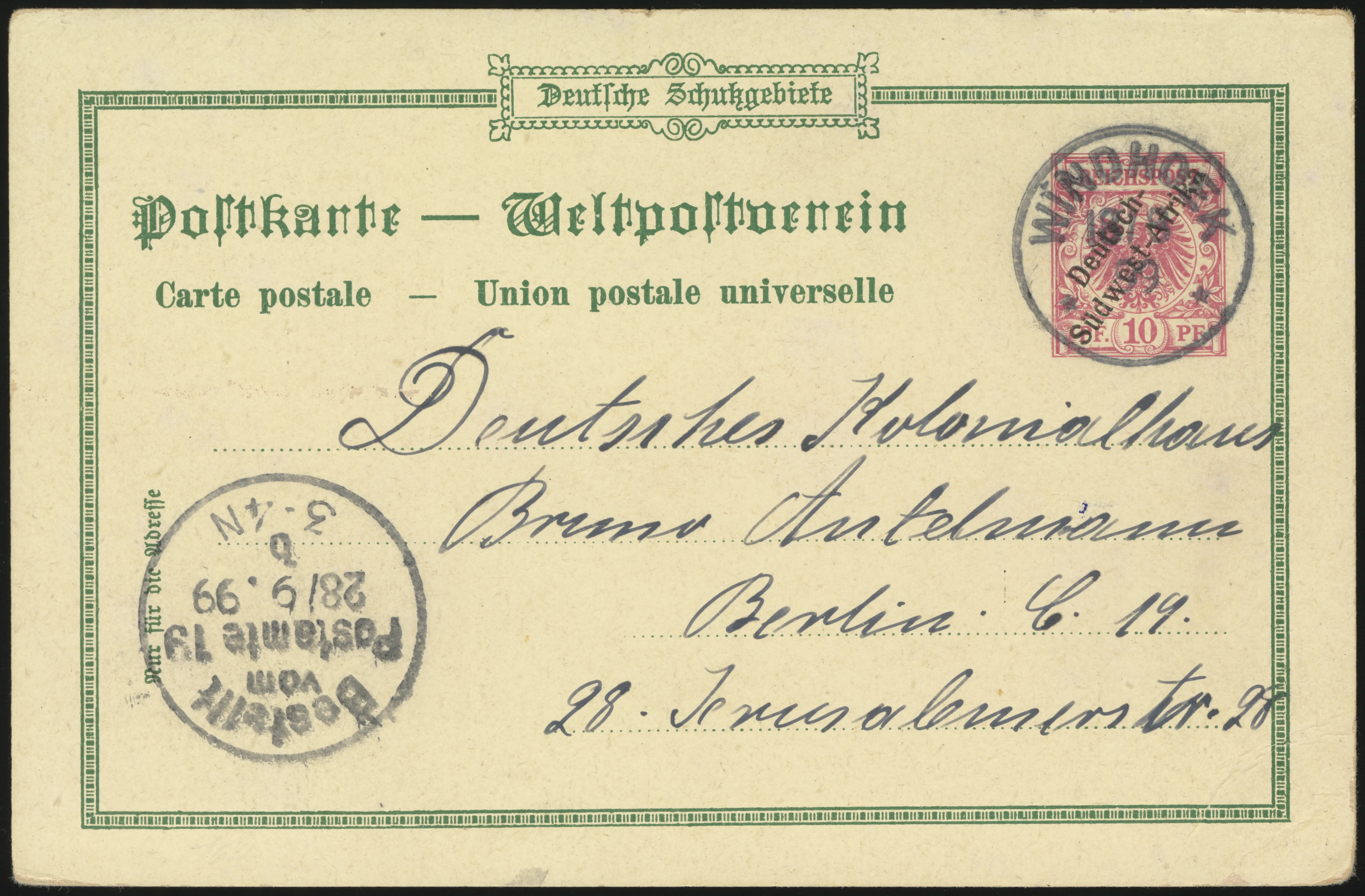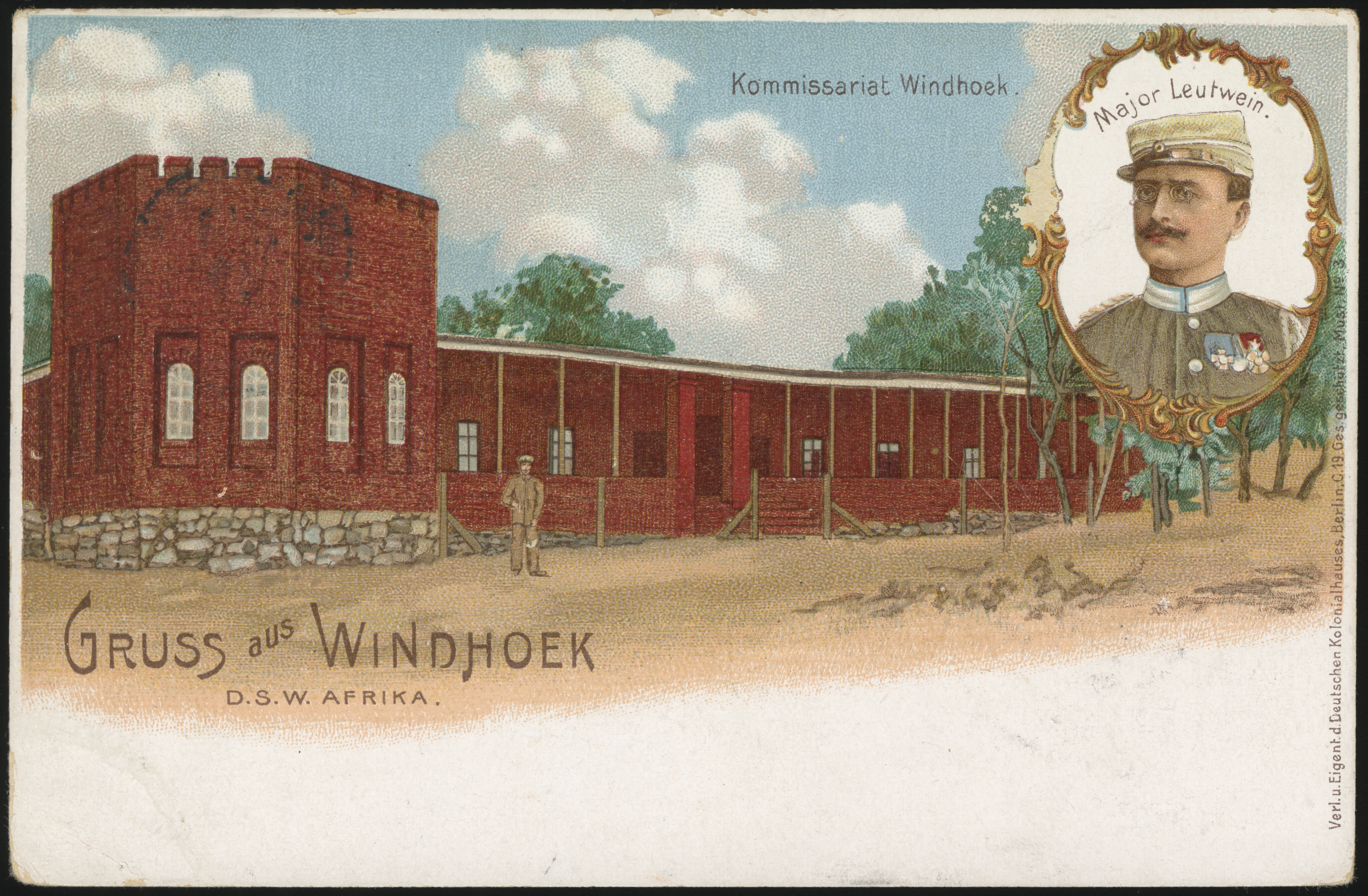 The color scene depicted the Windhoek Commissariat, and wished greetings from Windhoek.