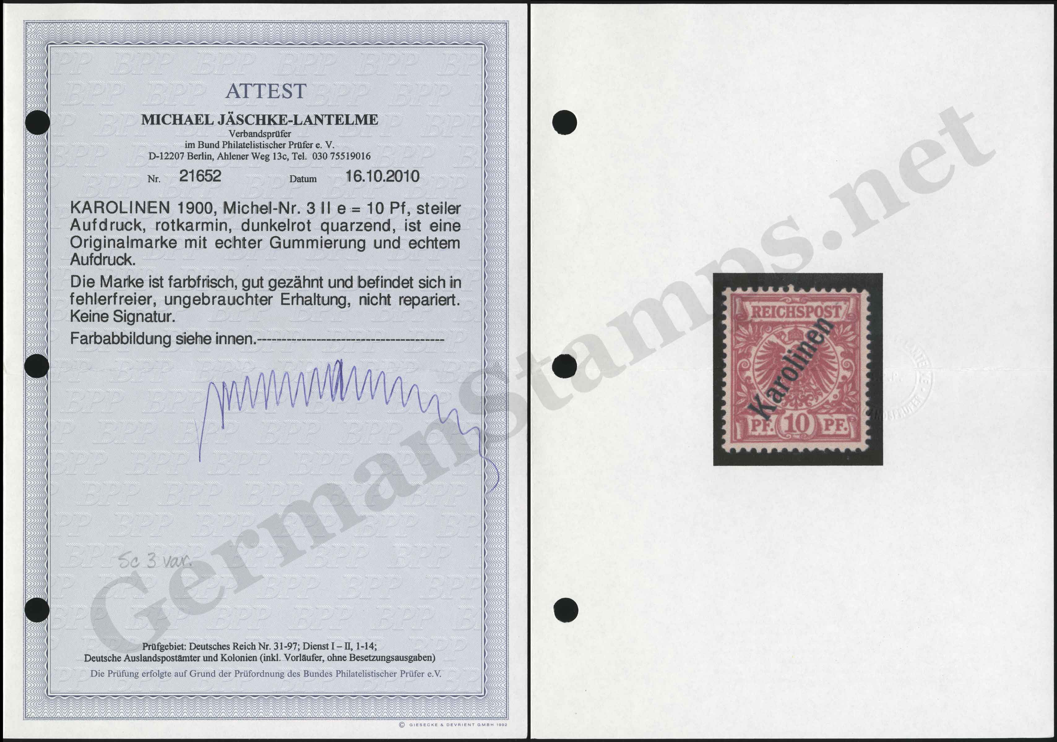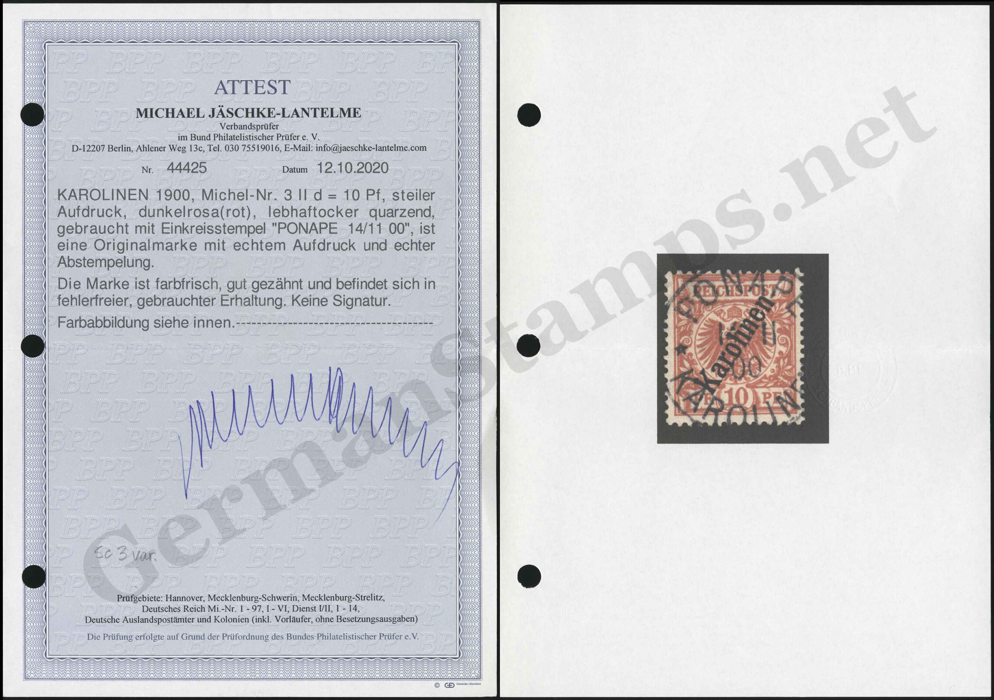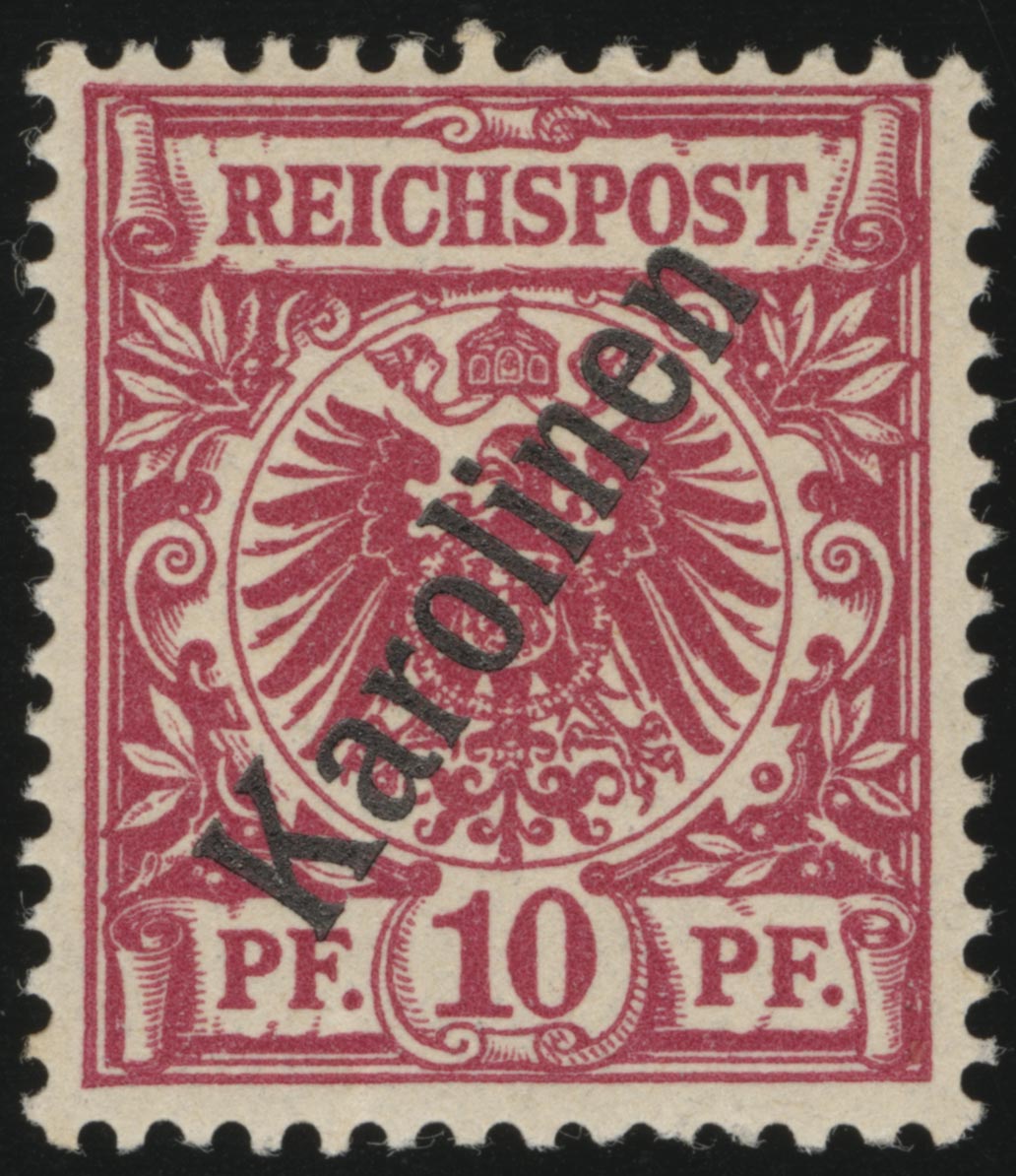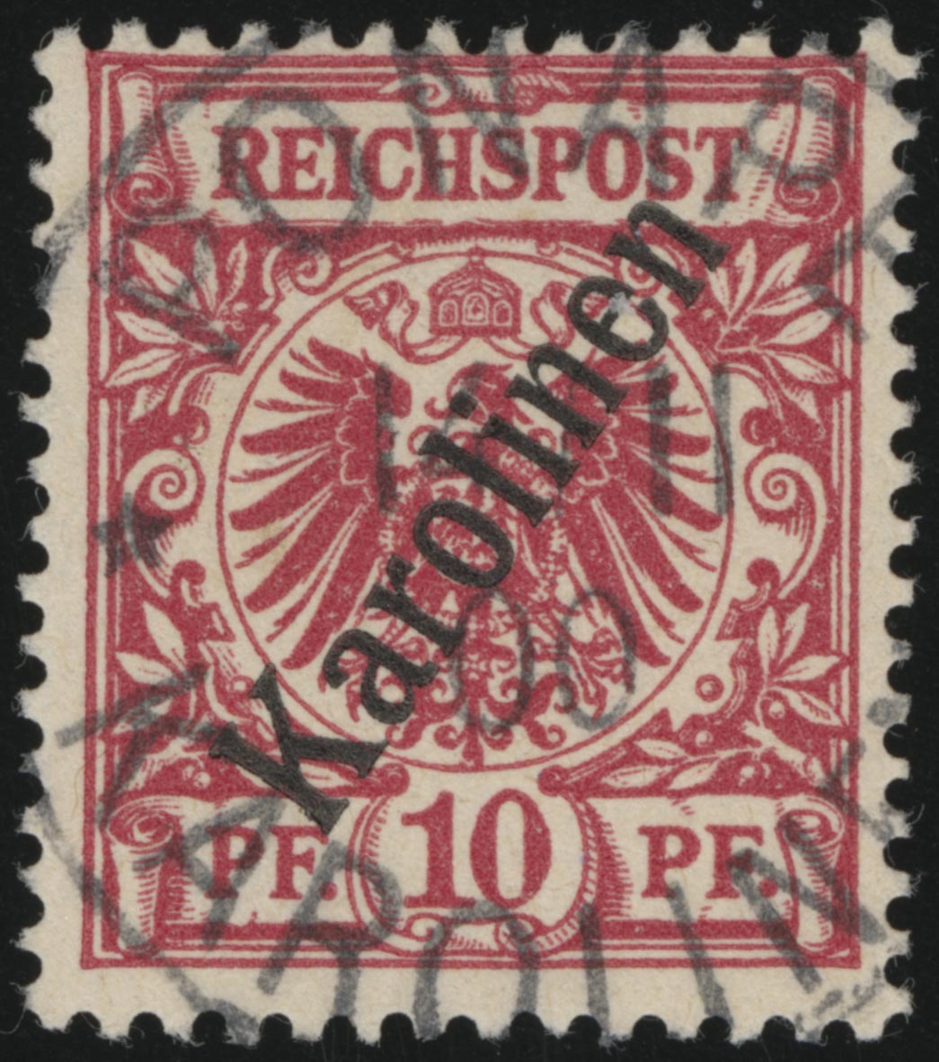 In May 1900, a second printing of Karolinen overprints came into use. This second printing featured the same “Karolinen” overprint, but at a steeper angle (56°) than the earlier printing (48°).