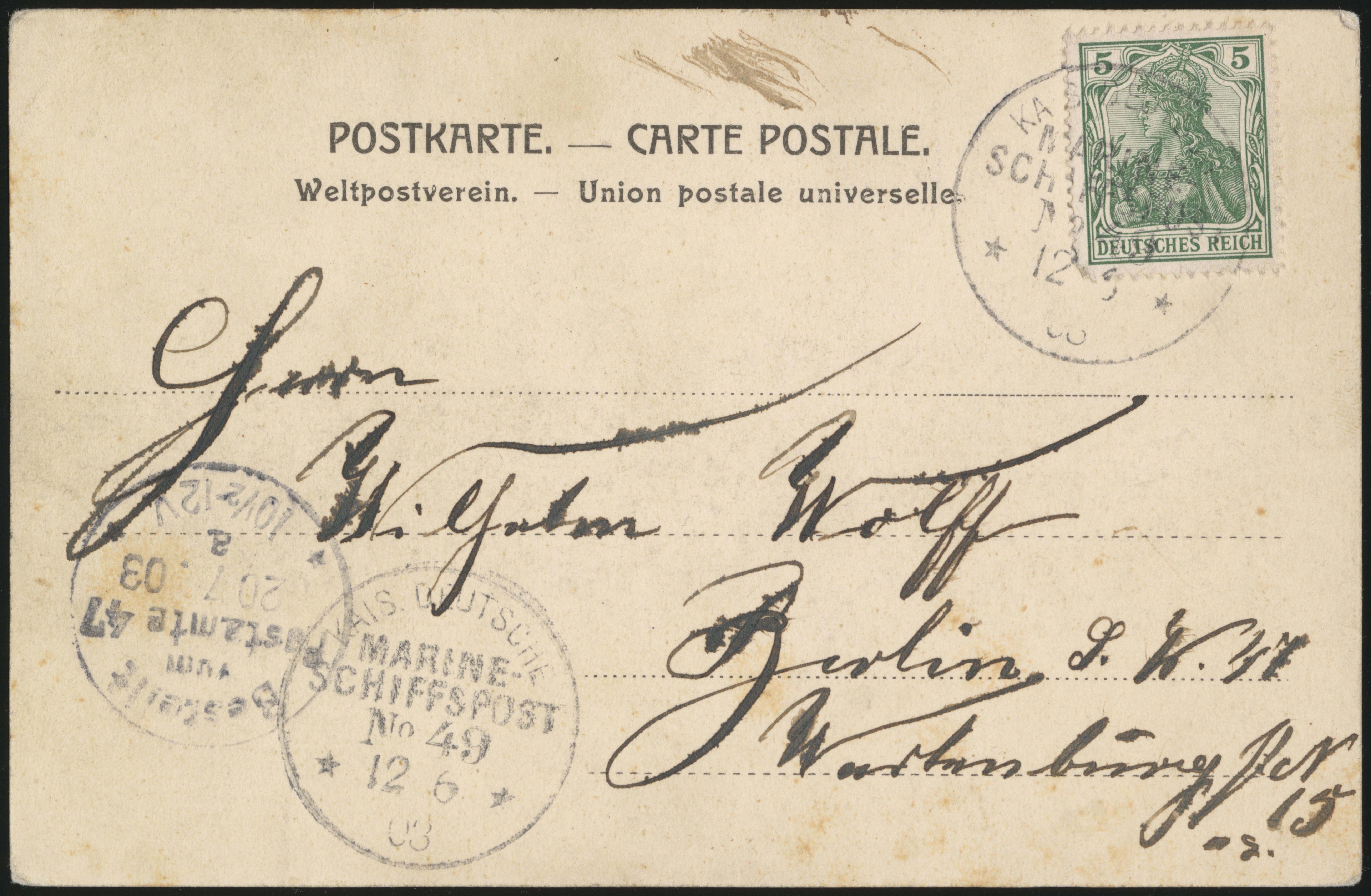 In 1902, 1903, and 1904, Main was chartered by the German government for three voyages transporting troops to and from China. She carried MSP cancellers on all three voyages – MSP 27 (1902), MSP 49 (1903), and MSP 5 (1904).